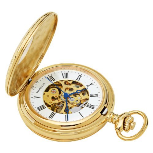 This classic, elegant and sophisticated gold-tone exhibition pocket watch from Gotham is the perfect addition to anyone's timepiece collection. Features include a precision 17 jewel mechanical movement showcased when the front and back covers are opened, highly polished intricately designed silver-tone case with Roman numerals plus scratch resistant mineral crystals to protect your timepiece. Other features include bold blue cobalt hands and a 15 inch curb chain that can attach to your belt loop ...